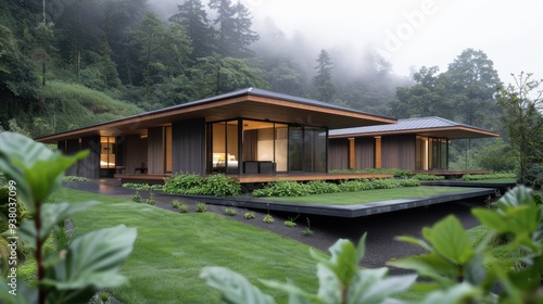 Holistic healing center in lush forest. Nature therapy, organic agriculture, and renewable energy with sustainable architecture to promote wellness, balance, and tranquility in a natural environment.