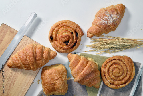 Homemade breads or bun on wood background, croissant puff cinnamon, breakfast food