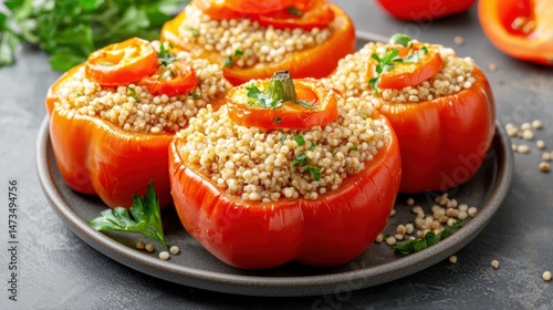 Homemade Food Concept, Stuffed bell peppers filled with quinoa, garnished with herbs, arranged on a dark plate.