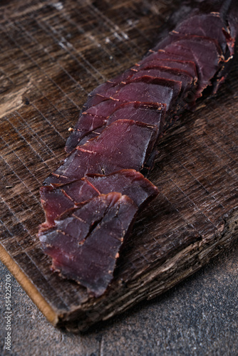 homemade jerky meat, basturma on a kitchen cutting board