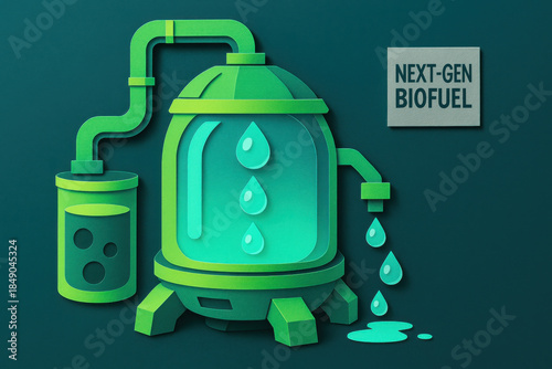 Hopeful paper cut futuristic bioreactor pod turning waste oil into clear biodiesel droplets. This next gen biofuel technology showcases neon green and cyan palette for innovation