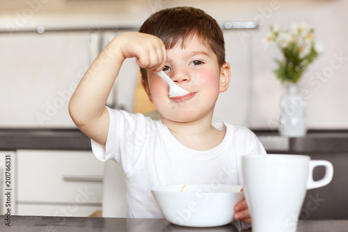 Horiontal portrait of attractive male child eats delicious porridge with milk, dressed in casual white t shirt, has good appetite after walk outdoor with mum, sits at kitchen table with bowl and mug