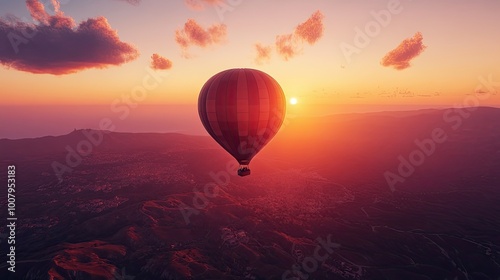 Hot Air Balloon Floating at Sunset Over Scenic Landscape