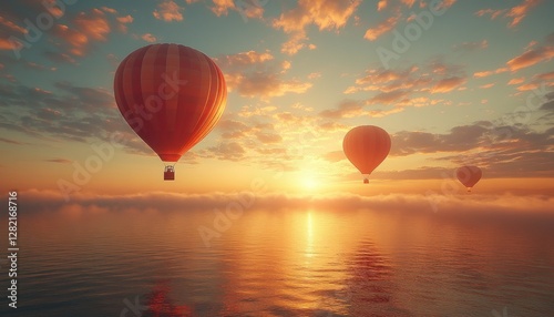 hot air balloon, sunrise, water, cloud, sky, travel, adventure, nature, orange, sky blue, calmness, scenic, tour tourism, exploration, freedom, serenity, daylight, horizon, landscape, peaceful, life events, morning, colourful, beautiful, warm, sunlight, summer, vacation, escape, view, picturesque, journey, beauty, leisure, romance, floating, vibrant, photo, image, environment, atmosphere, rural, calm, serene, destination
