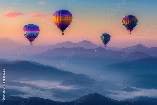 hot air balloon, balloon, mountain, sunrise, mist, fog, sky, landscape, nature, travel, adventure, aerial, view, colourful, vibrant, morning, dawn, peaceful, tranquil, serene, elegance, freedom, flight, dream, inspiration, beauty, wonder, horizon, cloud, blue, pink, purple, orange, yellow, green, red, light, gold, silhouette, panorama