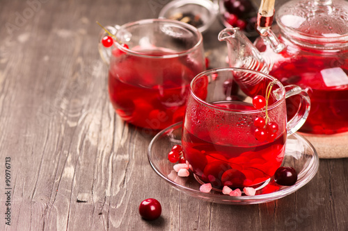 Hot berry tea in glass cups and teapot over rustic wooden background.