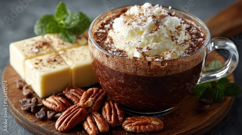 Hot Chocolate with Whipped Cream, Fudge, Pecans and Mint on Wooden Board