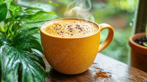 hot drink, hot, mug, yellow, steam, drink, warm, aroma, espresso, latte, plant, green, leaf, natural, blurred, outdoors, window, morning, relaxing, cosy, comfort, delicious, beverage, sharpened, closeup, table, wooden, detail, fresh, spiced, foamy, texture, chocolate, drop, rain, humidity, sunlight, outside, atmosphere, freshness, brew, relaxation