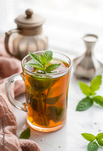 Hot herbal tea, served in Scandinavian style, bright background