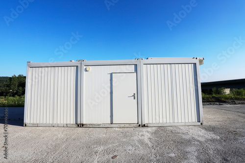 accommodation, architecture, background, box, building, business, cabin, cargo, construction, container, delivery, door, emergency, entrance, exterior, freight, habitable, home, housing, immigrant, immigration, industrial, industry, living, metal, mobile home, modular, office, outdoors, prefabricated, refugee, residential, room, shipping, steel, storage, temporary, transportation, war, warehouse, white, men at work