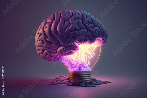 Human brain on lightbulb violet purple color background , creative thinking idea and inspiration innovation concept. Generative AI.