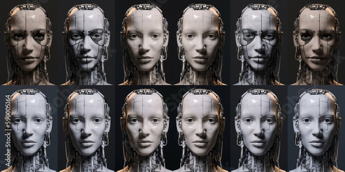 banner, human, face, recreation, artificial intelligence, automation, grid, multiple, mosaic, facial, concept, process, repeating, repetition, generative, ai, digital, imagine, unreal, step, progressive, illustration, example, figure, mechanized, sculpting, robotic