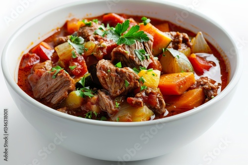 goulash, beef stew, paprika, beef, vegetable, white background, comfort food, food photography, epicure, white plate, culinary arts