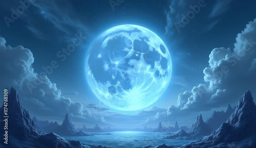 moon, sky, night, cloud, water, space, blue, sea, planet, full, cloud, nature, dark, light, landscape, ocean, moonlight, fantasy, horizon, astronomy, star, earth, abstract, black, wallpaper, blue background, background, black background, intricate, smooth, photograph, art, computer art, shiny