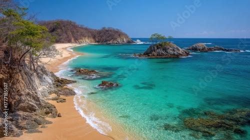 Idyllic Shores of Huatulco: Pristine Sand Beach with Crystal Clear Turquoise Waters and Vibrant Skies