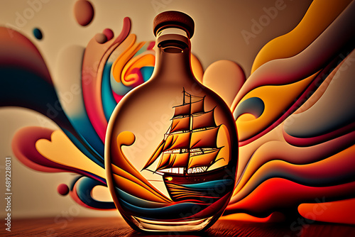 ship, bottle, colourful, wave, digital illustration, art, design, ocean, sea, nautical, maritime, sailboat, glasses, abstract, background, creative, concept, decoration, modern, trendy, vibrant, surreal, fantasy, imagination, three-dimensional, render