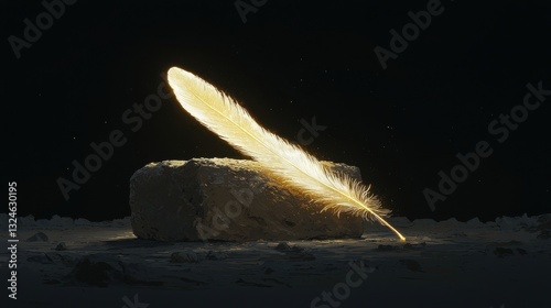 Illuminated feather resting on a stone, golden light in the dark. Magical or spiritual concept.