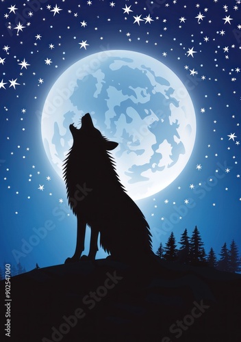 wolf, howling, full moon, night, silhouette, sky, star, vector, illustration, wild, nature, wilderness, animal, majestic, moonlight, outdoors, scenery, nocturnal, forest, dark, night sky, dramatic, powerful, wild animal, mystical, landscape, starry sky, artwork, digital artwork, predator, howl, alpha, eerie, adventure, untamed, solitude, intensity, celestial, fantasy, winter, generative, ai