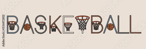 Illustration of basketball text with hoops above and below, balls in nets, and court lines underneath – Suitable for sports marketing, basketball fan art, or athletic content