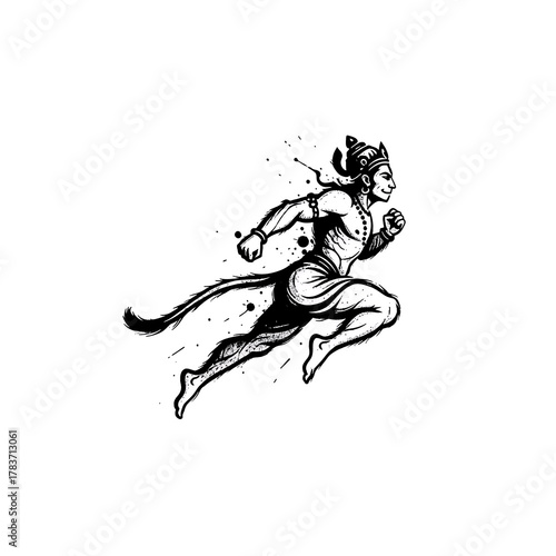 mythical, figure, running, dynamic, motion, illustration, black-and-white, artistic, vignetting, traditional, folklore, culture, speed, movement, character, ink, detailed, drawing, fantasy, legend, classic, spiritual, energetic, powerful, strong, cultural, expressive, graphic, hand-drawn, myth, symbolic