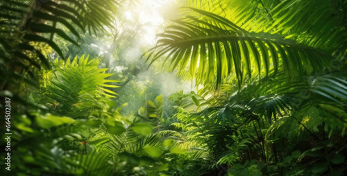 Illustration of tropical fern bushes background lush green foliage in the rain forest with nature plant tree.