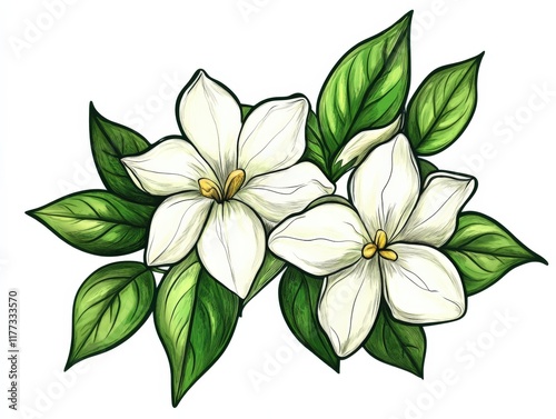 flower, flower, white, leaf, leaf, green, illustration, floral, botanical, nature, plant, drawing, bloom, blossom, flora, artwork, clip art, isolated, spring, summer, garden, decorative, design, art, botany, element