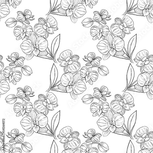 Illustration seamless pattern drawing of black doodle line orchid blooming, random branches on white background for clothing fabric textile, wallpaper, paper wrapping