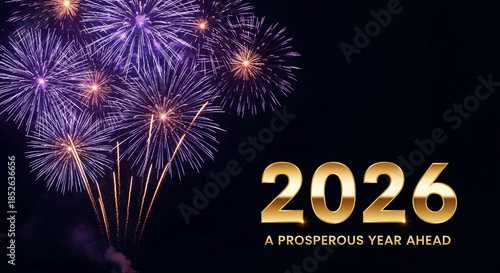 Image of purple and orange fireworks on a black background, with golden number 2026. Represents a celebration and anticipation for a new year ahead.