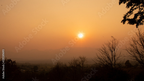 Image of sunset mountain with orange sky. The shadow of the high mountains in brown. And black shadow of the trees without leaves. This is good view. At 18.31 pm Pai, Thailand.