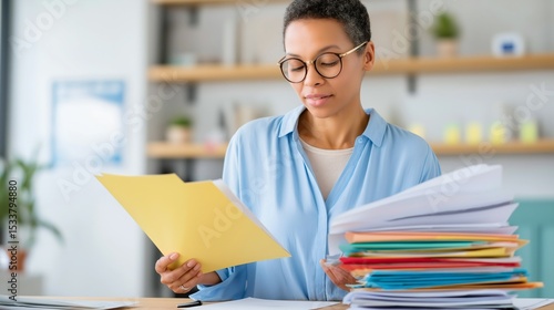 In a bright office space, an executive coach reviews progress reports while surrounded by colorful folders and paperwork, focused on effectively guiding her client’s development