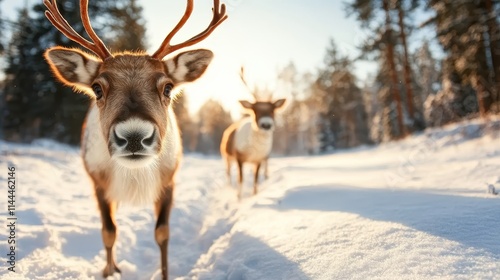 In the gentle light of the golden hour, two reindeers explore a snow-covered path in a forest, evoking feelings of adventure and closeness to nature.