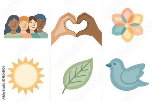 vector, icon, face, leaf, nubes, sun, background, flower, inclusive, pastel, no, hand, smiling, diverse, text, white, tone, life, set, geometry, depth, dimension, illustration, perspective, angle, collection