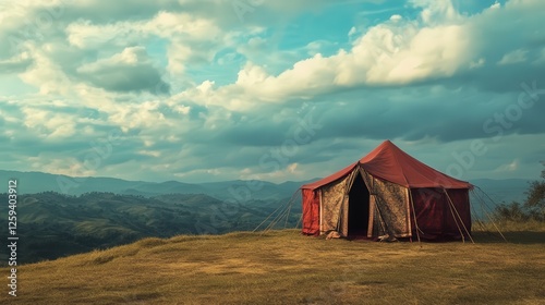 Indian tent set against the backdrop of rolling hills, with rich colors and textures of the tent contrasting against the natural beauty of the landscape