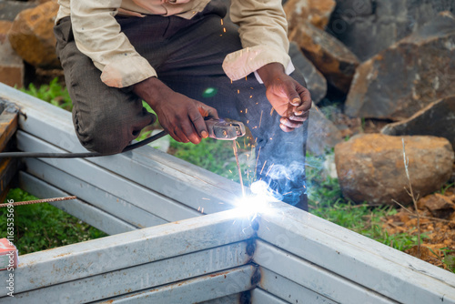 Indian worker doing welding. Close-up Metal worker welding iron in a workshop