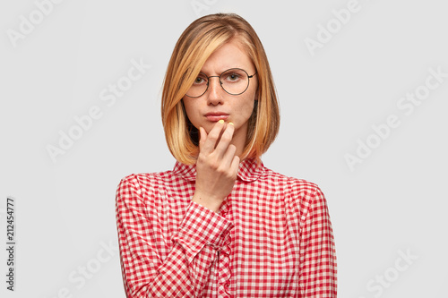 Indoor shot of pretty Caucasian female with serious intelligent look, holds chin, tries to make decision concerning changing work place, wears checkered blouse and glasses, isolated over white wall