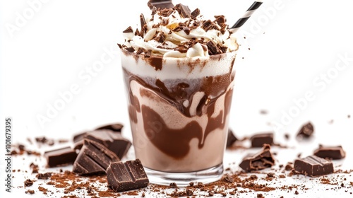 Indulgent chocolate milkshake with whipped cream and chocolate shavings, splashed artfully in a glass, surrounded by chocolate pieces on a white background.