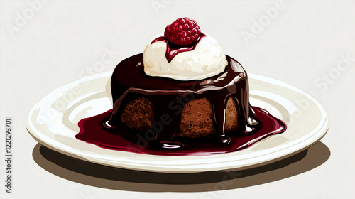 Indulgent molten chocolate dessert topped with raspberry and whipped cream