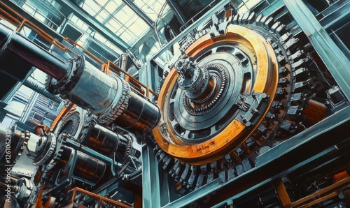 Industrial machinery, intricate gears, teal, orange hues.