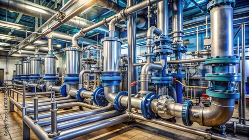 Industrial plant with pipelines, valves, and liquid pumps for production equipment , factory