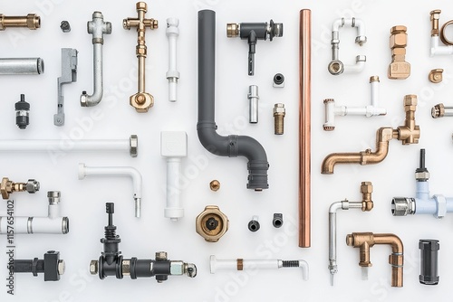 Industrial Plumbing Components Displayed in Minimalist Style on White Background
