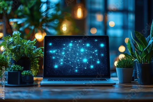 Innovative office space design featuring a laptop displaying high-fidelity digital network visualization urban workspace night ambience