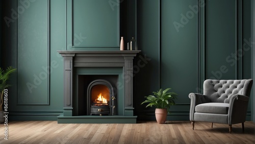 Interior home with dark classic burning fireplace and armchair on dark green wall copy space mock up