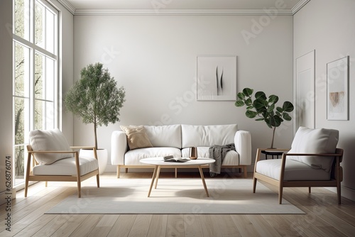 Interior of a contemporary white living room with a white sofa, small entrances, and a wooden floor. Two mock up black armchairs. Generative AI