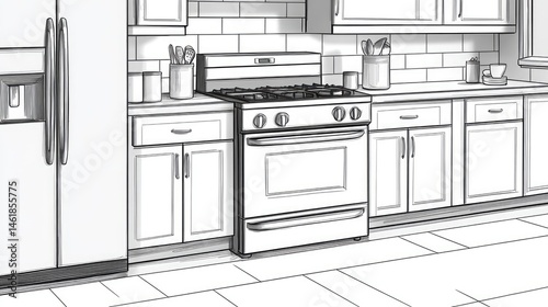 kitchen, appliance, stove, oven, cabinet, refrigerator, countertop, floor, line, drawing, vignetting, modern, design, illustration, furniture, light, white, grey, tile, cooking, home, interior, appliance, drawing, simple, image, black, and, contemporary, outline, graphic, rendering, clean, basic
