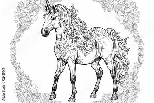 Intricate line drawing of a horse with mandala patterns, featuring detailed and elegant designs suitable for coloring, highlighting the horse's expressive features and flowing mane in a black and whit