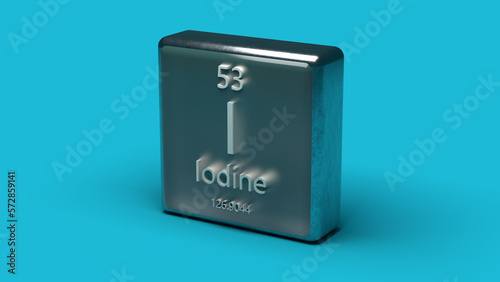 Iodine element from the periodic table series. Metallic icon set on blue background. 3d rendering