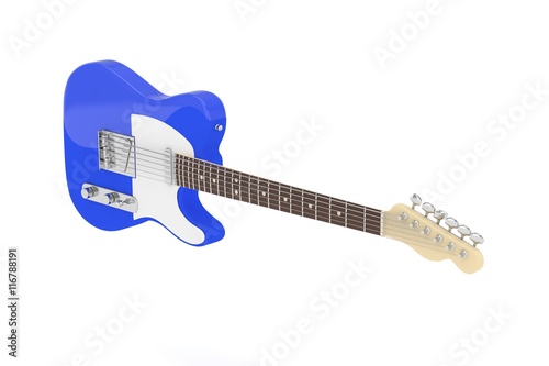 Isolated blue electric guitar on white background. Concert and studio equipment. Musical instrument. Rock, blues style. 3D rendering.