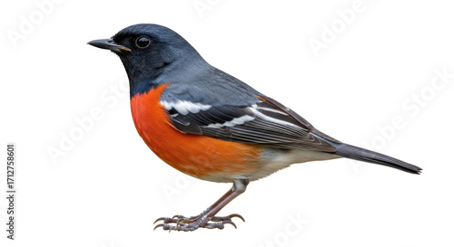Isolated orange-breasted bird perching, gray and orange robin with black head, isolated