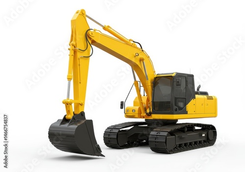 Isolated yellow excavator with a black bucket and treads against a white background in a studio setting