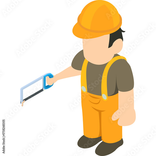 Isometric Illustration of a Construction Worker in Yellow Overalls and Orange Hard Hat Holding a Saw Tool Against a Transparent Background